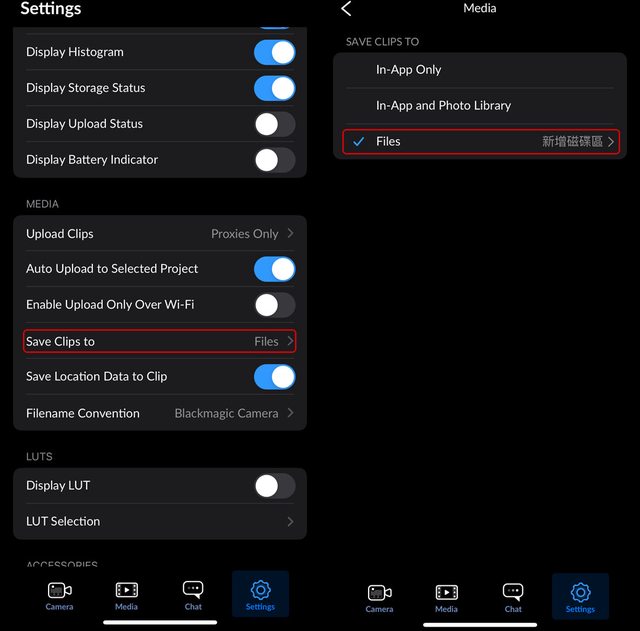 ▼Blackmagic Camera App的Setting選單,找到Media的Save Clips to項目,進入後指定