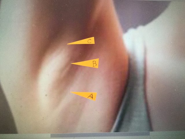 醫生指出下面這張是最明顯的, 最常見的假體注入口可以被發現, 也因此