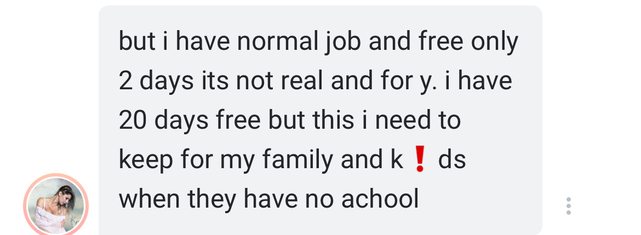 她回答不會,她有正常的工作,然後只有兩天假,她有20天假期,但是要陪家庭和小孩