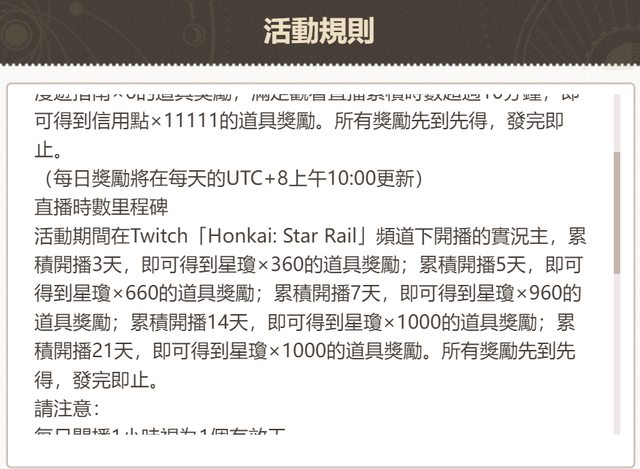 參與《崩壞:星穹鐵道》Twitch 直播激勵活動,贏取豐厚現金和星瓊等獎勵! https://act.hoyoverse.com/sr/event/e20230914webcast/index 剛看到mihoyo分享的 感覺獎勵還不錯 但活動又寫「獎勵先到先得 發完為止」 https://i.imgur.com/PGRnN5Q.png