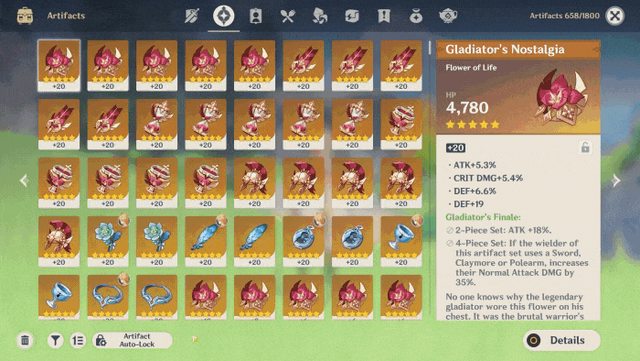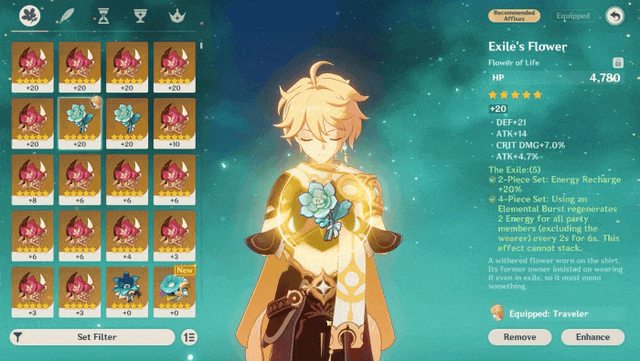 聖遺物強化介面的其他改善: 1.一次強化可消耗的道具增加至15個。 2.增加「階段放入」的功能。開啟後若放入的素材少於欄位數量,且本次強化可以使 目標聖遺物達到4/8/12/16級時,則不會自動繼續放入其他素材。 3.在「設定/其他」中可以選擇是否要快速放入五星聖遺物作為強化素材。 配合前文提到的自動鎖定功能,我們希望這些改動能夠讓旅行者更方便地管理五星聖遺物。 https://i.imgur.com/Fsn01N9.gif