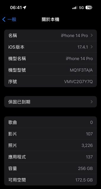欲售物品:二手/過保 Apple iPhone14 Pro 256GB 6.1吋/深紫色/iOS 17.4.1
