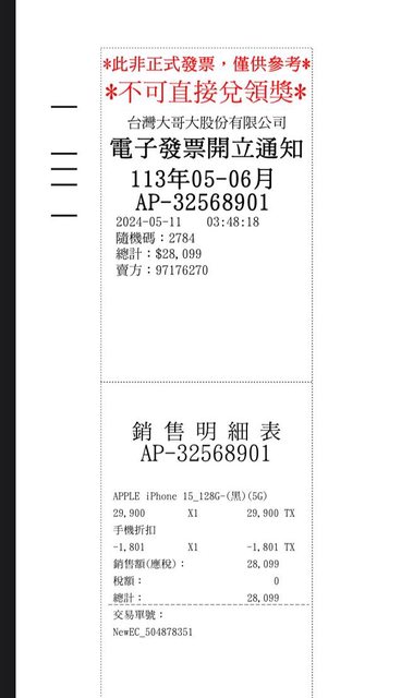 購買來源:台哥大【母親節優惠】APPLE iPhone 15 128G(黑)