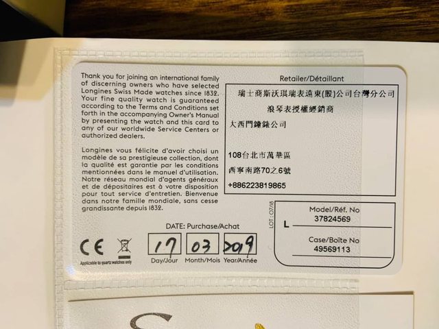 品牌:浪琴 型號:L37824569 保卡:如圖 金額:20000 地區:台南 配件:原廠盒單齊全(盒子自然氧化、錶枕也氧化有補一個) 聯絡:站內信交換line 交易方式:台南高雄可面交 外縣市可另外討論面交地點 新舊:8成,正常使用痕跡,鏡面陶瓷圈皆無傷