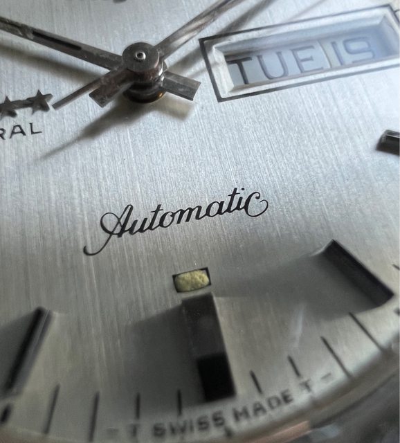 色直紋面盤,6、12上的夜光點已氧化成鵝黃色,機芯是508自動上鏈機芯、按壓式日期,
