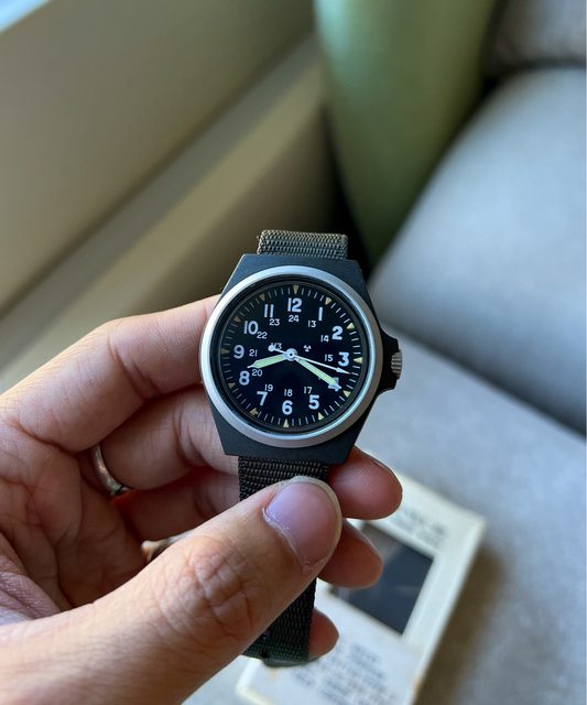 要以二戰時期日本軍錶為設計概念,面盤全阿拉伯數字簡單易讀,時分針的有夜光塗料(