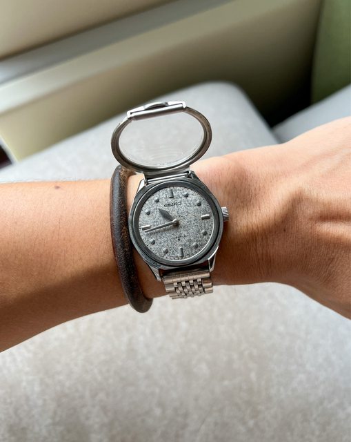是正面可以開蓋,讓視障人士可用手觸摸指針及時標判斷時間,面盤沙礫面材質,可能是