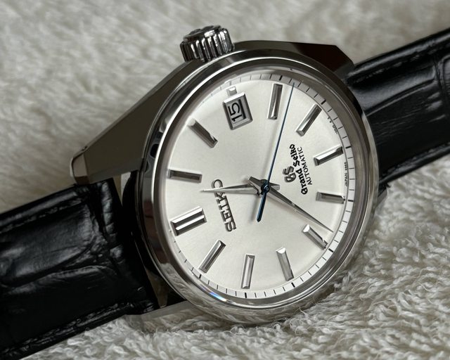 此錶與元祖44GS同為銀白面盤,且使用與元祖44GS相同的細長時、分針組,此針組打磨細