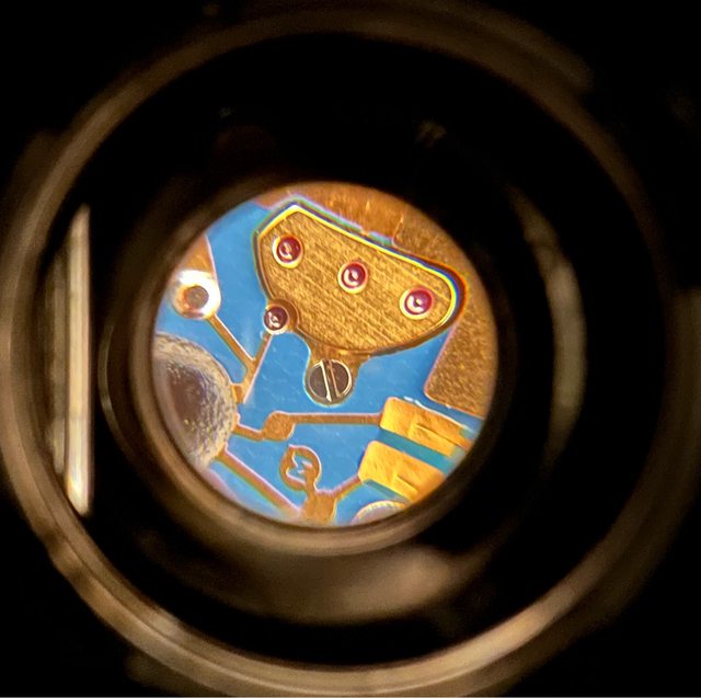 這支腕錶最吸引我之處在於其搭載的ETA 955.112石英機芯,擁有金色飾面和藍色電路板