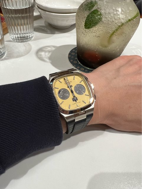 現,灰黃(輝煌)的跳色搭配令人驚艷,再加上以黑色框邊的時分指針與黑面12小時計時弧