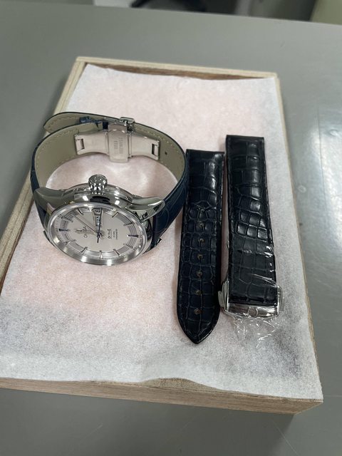 周邊配件:原廠鱷皮錶帶(未使用過)、副廠藍牛皮錶帶(少配戴)、盒單齊全、送原廠洗