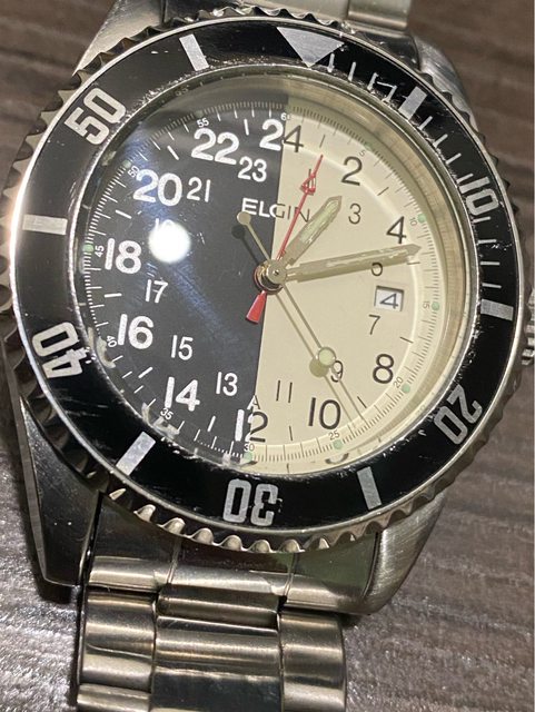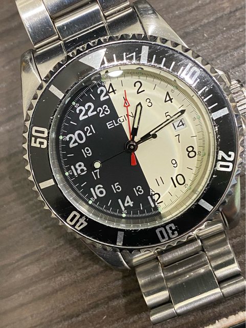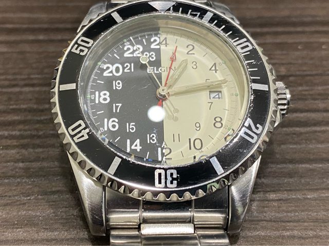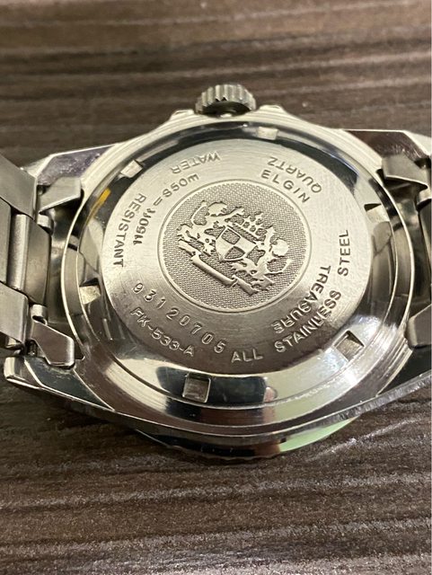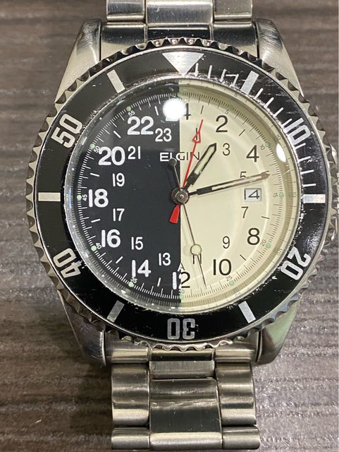 【商品名稱】ELGIN 艾爾琴 FK-533 【商品價格】已售出1560元(含店到 【新舊程度】如圖 【附件】單錶乙顆,原廠錶帶 ————————————————— 型號FK-533-A 少見的艾爾琴石英潛水錶, 黑白晝夜面盤 非常吸睛,抽屜必放一顆石英錶,拿了就走,不必調整。 錶徑約40mm 走時正常 日期快調正常 旋入式龍頭