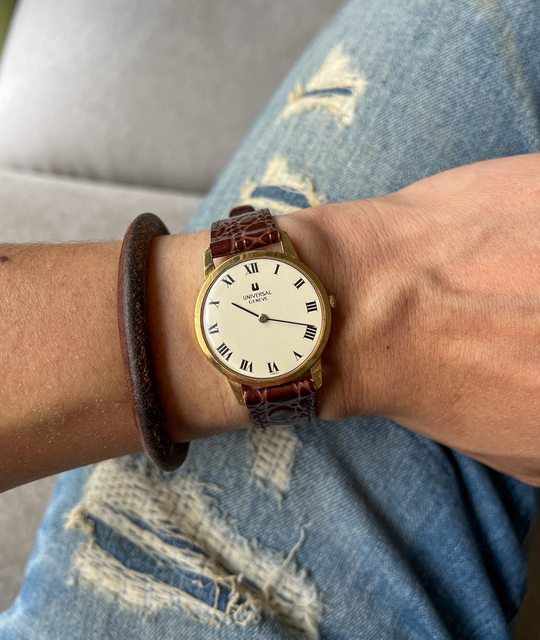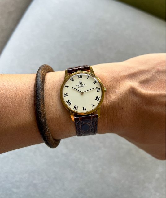 2.Universal手動上鏈機芯,1970年代生產,金色錶殼搭配淡淡奶油色面盤,二針羅馬時