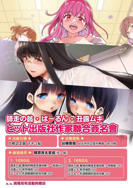 為慶祝即將上市的三本新書!本次在未來數位的努力邀約下,即將於7/22特別舉辦「師走の翁・ばーるん・丑露ムキ」日本HIT出版社三大作家之聯和簽書會!我們將從有購買簽名會抽選資格套組(一般版or特典版)的同好中抽選出50名幸運兒參加聯合簽書會!期待大家的踴躍參與!!