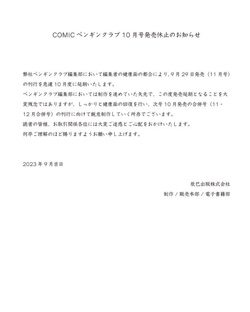標題[洽特] 月刊ペンギンクラブ11月號將不發行