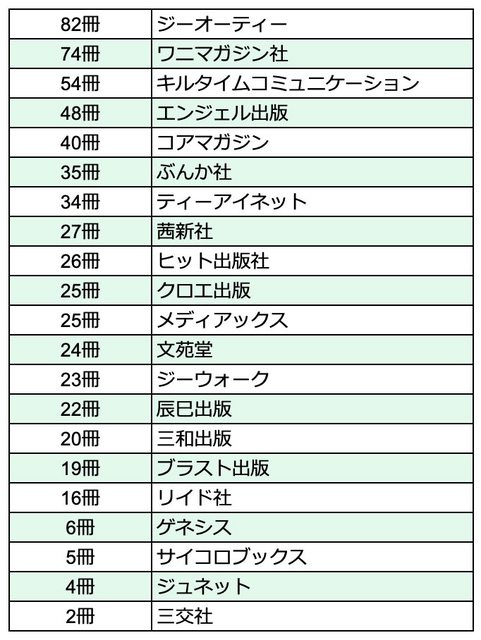 2023年日本情色漫畫紙本單行本出版冊數的出版社排行榜
