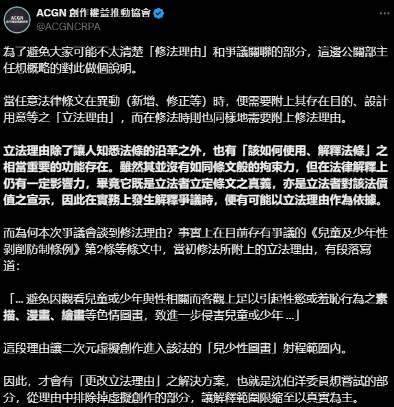 但現行版本的立法理由有寫到"防制真實存在之兒童或少年遭受任何形式之性剝削"