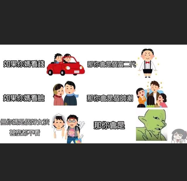 外貌,因為我自己的母親不看錢財,所以我不是富二代;(這邊我有乖乖用分號)