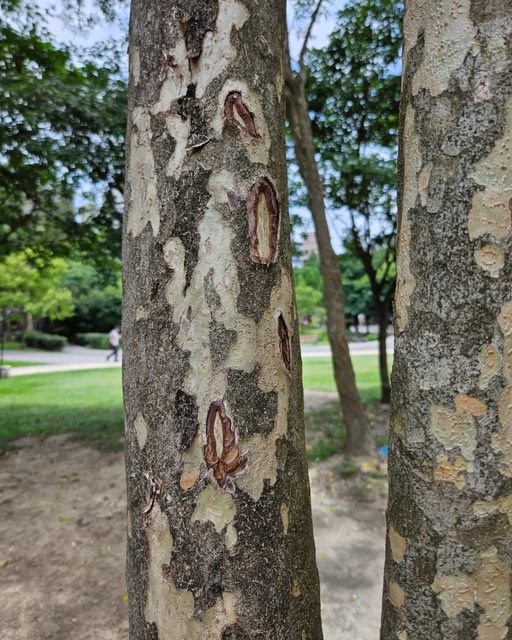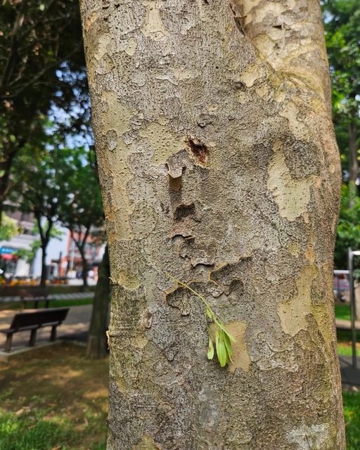 樹幹上常見雲朵形的剝落痕跡,非常漂亮。但我更愛和孩子輕撫上面長短不一的垂直結痂