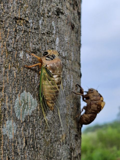 我們發現泥土中露出兩隻眼睛的若蟲、在樹幹上緩慢爬行的若蟲、正在羽化的瞬間、羽化