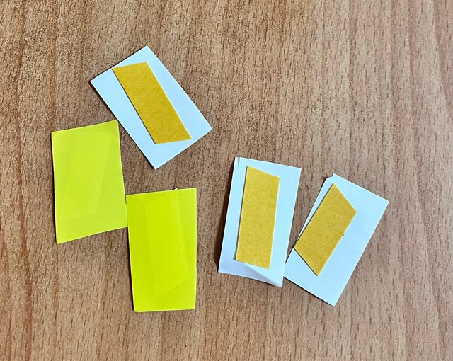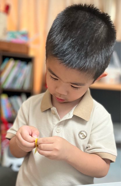 拿出黃色色紙剪成方便黏在月亮的大小,寶貝月齡較小可以用撕的方式進行,將色紙後方