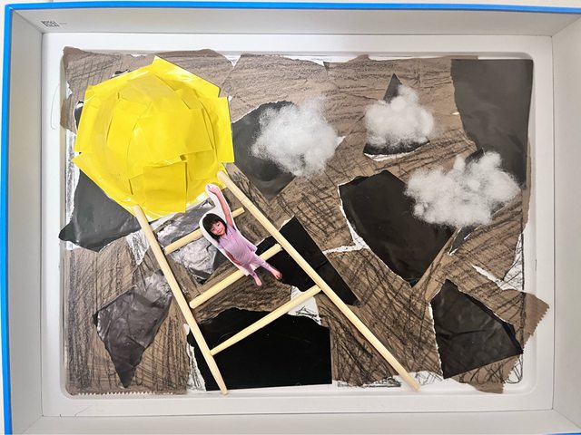 最後將孩子照片剪下,後面貼上布膠,讓孩子把自己的照片貼在梯子上方,作品就完成囉