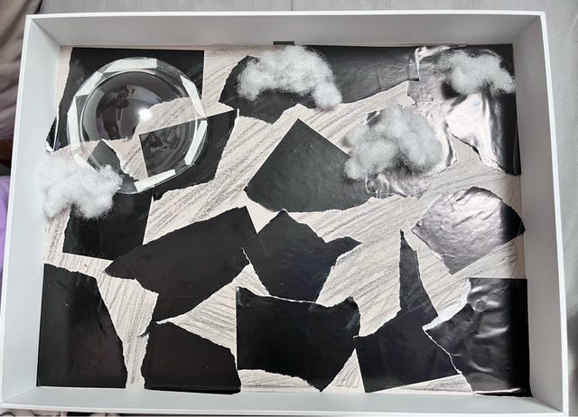 說明:先將紙盒或圖畫紙用撕貼方式將內部用白膠貼上黑色色紙/廣告紙/回收紙袋,如果
