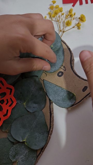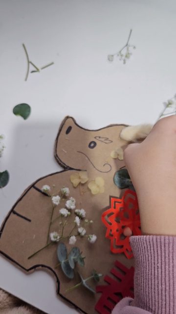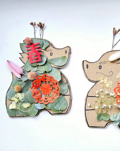 材料:龍土鈴造型紙板、窗花剪紙、乾燥花材