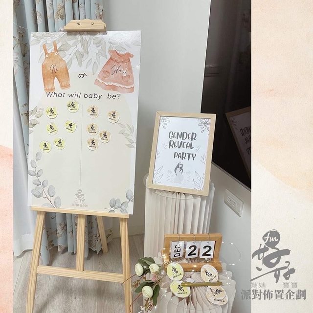 布置的小物也更顯有質感,老師也有幫忙小小主持,讓大家有線索可以猜寶寶性別,過程