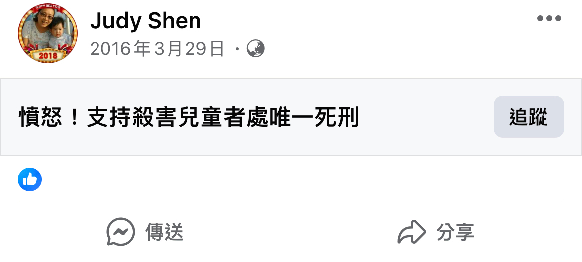 推 she820108 : 很憤怒,但覺得唯一死刑不是合理訴求,可能無法讓 03/15 22:36