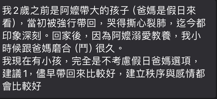 → FloraPiglet : 父母一方只要請一天把寶寶送回公婆家照顧一週、甚 04/09 13:21