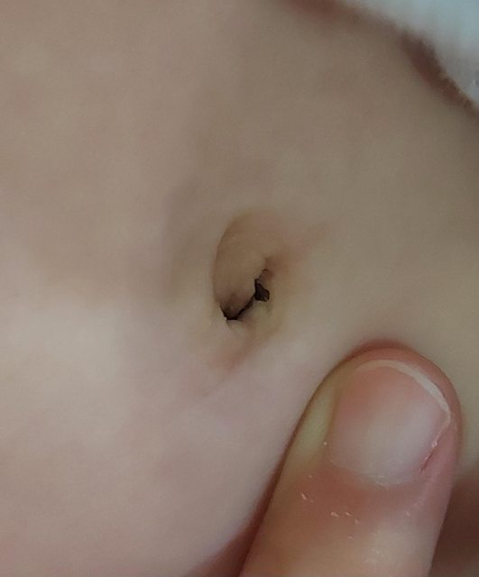 當時我沒有很仔細的看,但今天再仔細看看,發現寶寶的肚臍有一條黑色的線,疑似息肉萎