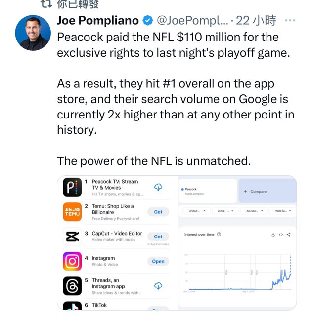 然後這讓Peacock的App下載量暴增