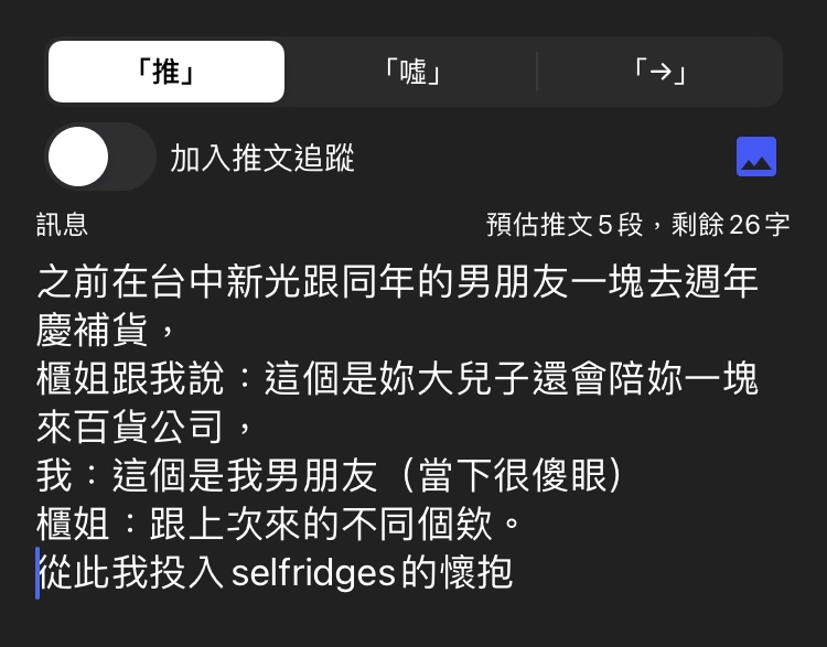 → kforcat: 身。而且邀請我的櫃姐根本全程不在我身 49.216.107.171 07/10 10:42