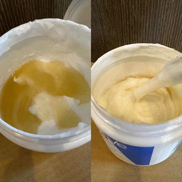混合之後潤澤霜變成一個比較液態乳液狀但又很像磨砂膏拿來搓腳