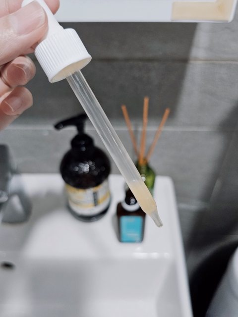 乳狀精華滴管設計,味道像維他命C,等個5-10分鐘沖水