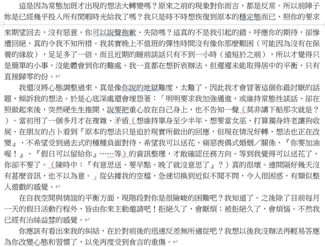八月底她在習慣性的睡前通話告訴我:儘管原本很暈,但因為我給的壓迫感太重,而