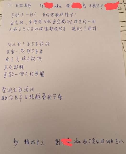 噓 rindesu : 你不是之前才手寫信給女生嗎? 12/21 13:45