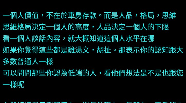 噓 T4XI : 說句實話,我真沒看過哪個有錢人會在推文裡吹噓自己 10/13 11:32