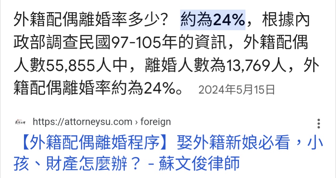 → etiennechiu : ~4倍!所以不是你認為的外籍配偶離婚率比較低,事 10/20 13:50