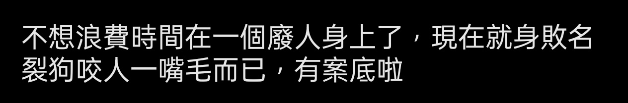 不想浪費時間在一個廢人身上了,現在就身敗名裂狗咬人一嘴毛而已,有案底啦