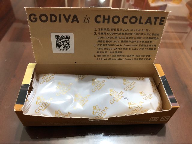 沿著虛線側開盒裝,本冰橫躺在內,盒蓋寫著GODIVA,有種高級感~