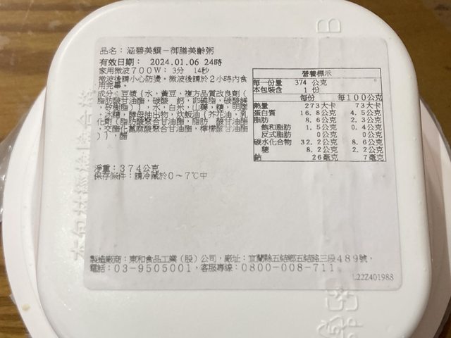 【規格/內容物/熱量】:374公克/豆漿、白米、山藥、糖/273大卡