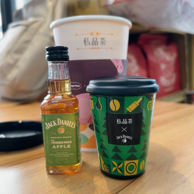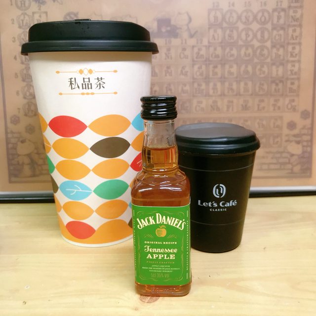 仙女紅茶一杯、jack Daniels 蘋果口味威士忌迷你瓶一罐、現在有加贈飲料杯