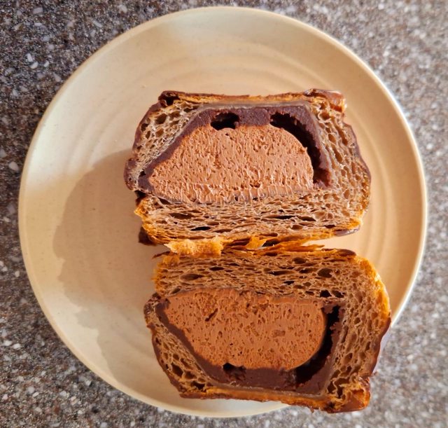 日本全家這款使用了苦甜巧克力 剛從冰箱拿出來吃會稍微偏硬 層層口感的酥皮跟巧克