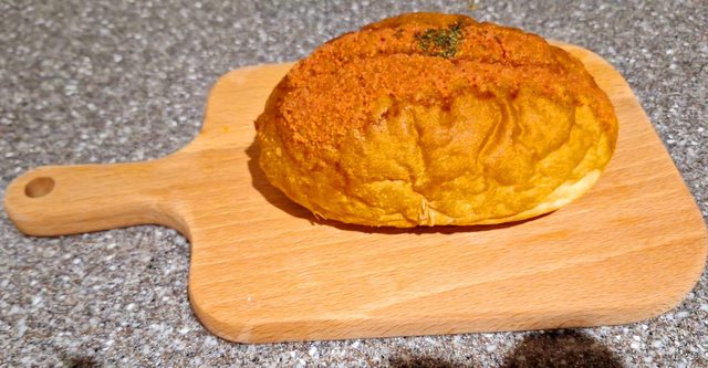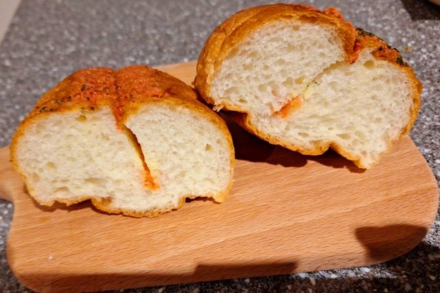 小小的法國麵包 有顆粒跟泥狀口感的兩種明太子 口感是有點小咬勁的法國麵包味道 個