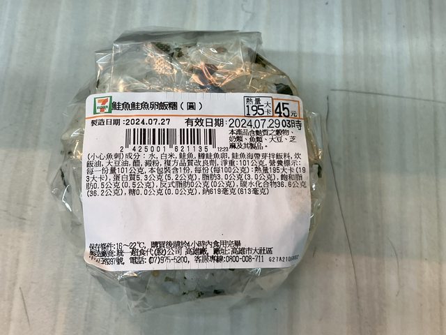 御飯糰-鮭魚鮭魚卵:101公克/白米、鮭魚、鮭魚卵/195大卡