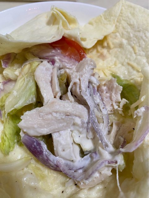 攤開來看裡面有蠻多生菜跟雞肉,值得稱讚的是肉蠻大塊,不是雞絲,前半部肉比較少,