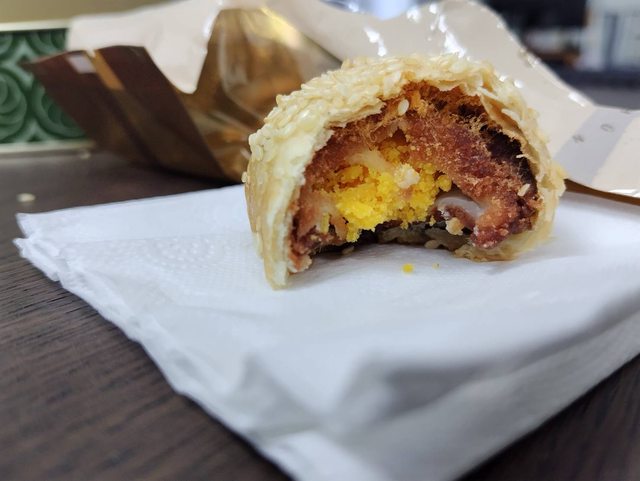 內餡是紅豆沙、肉鬆、鹹蛋黃跟麻糬,跟以前吃的北港日興堂有點像
