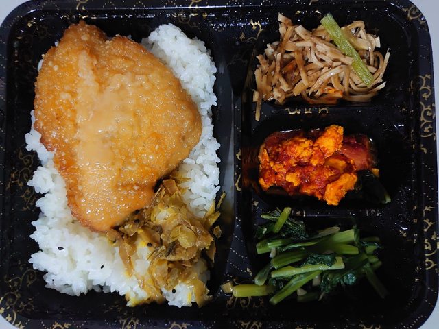 主菜雞排,配菜豆絲、蕃茄炒蛋、菠菜